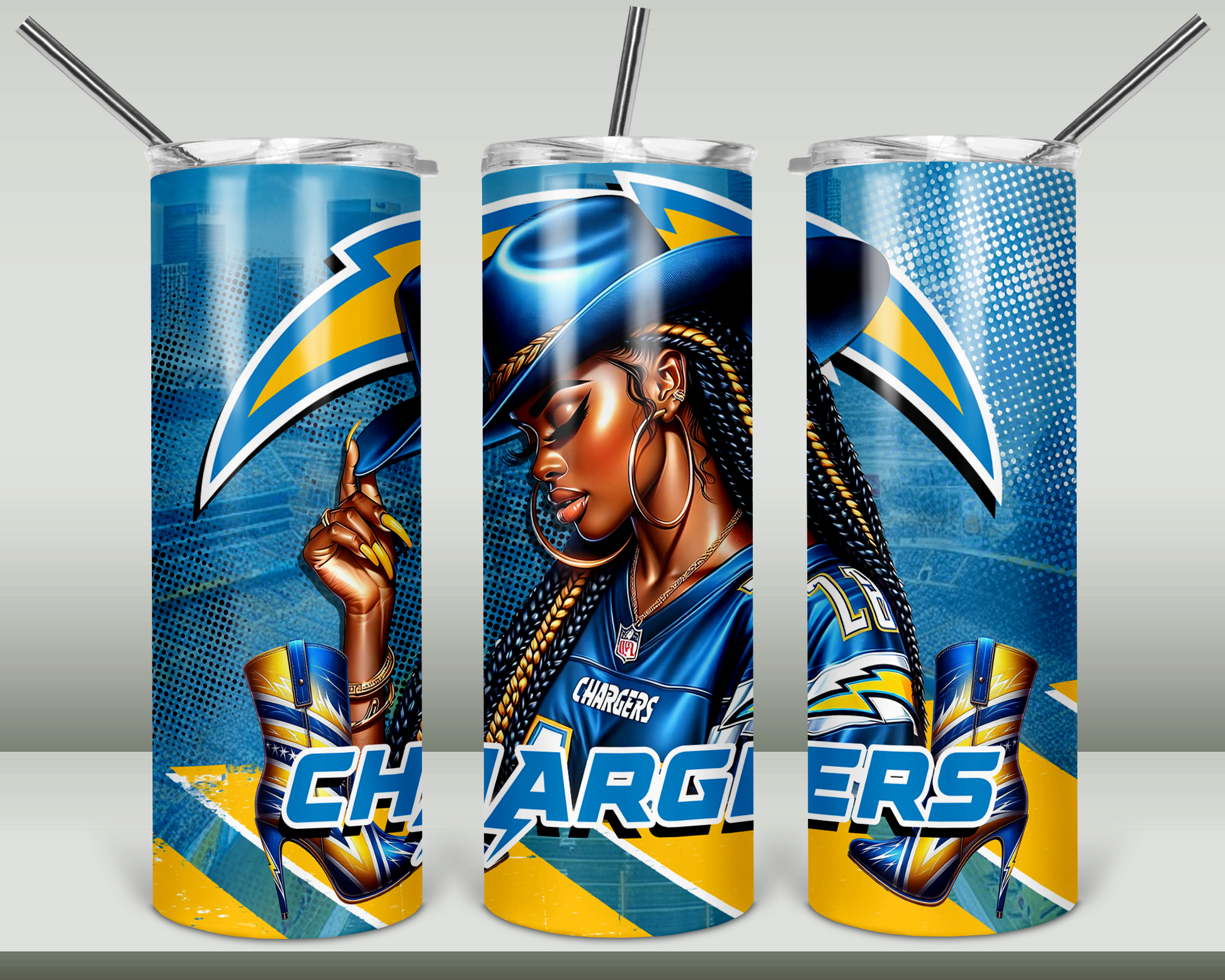 Get ready to show off your team spirit in style with our Chargers Bundle. The bundle includes: Cowgirl Shirt, clank fan, stainless steel tumbler with straw. Show your enthusiasm and represent your team with this stylish set.